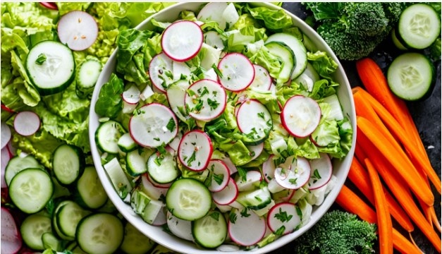 Для салата понадобятся следующие овощи: редис, морковь, айсберг, сельдерей и огурцы. Редис нарезается тонкими кружками, морковь - соломкой, а остальные ингредиенты - мелкими кусочками. Все овощи смешиваются в большой миске с заправкой, при необходимости добавляется соль и черный перец. После этого салат настаивается 2-3 минуты перед подачей.