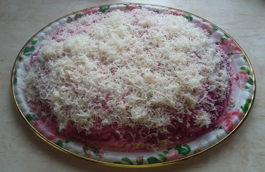 Сверху посыпьте натертым твёрдым сыром, и ваш салат «Подарки осени» готов! Это блюдо отлично подойдет как для повседневного стола, так и для праздничного застолья. Наслаждайтесь!