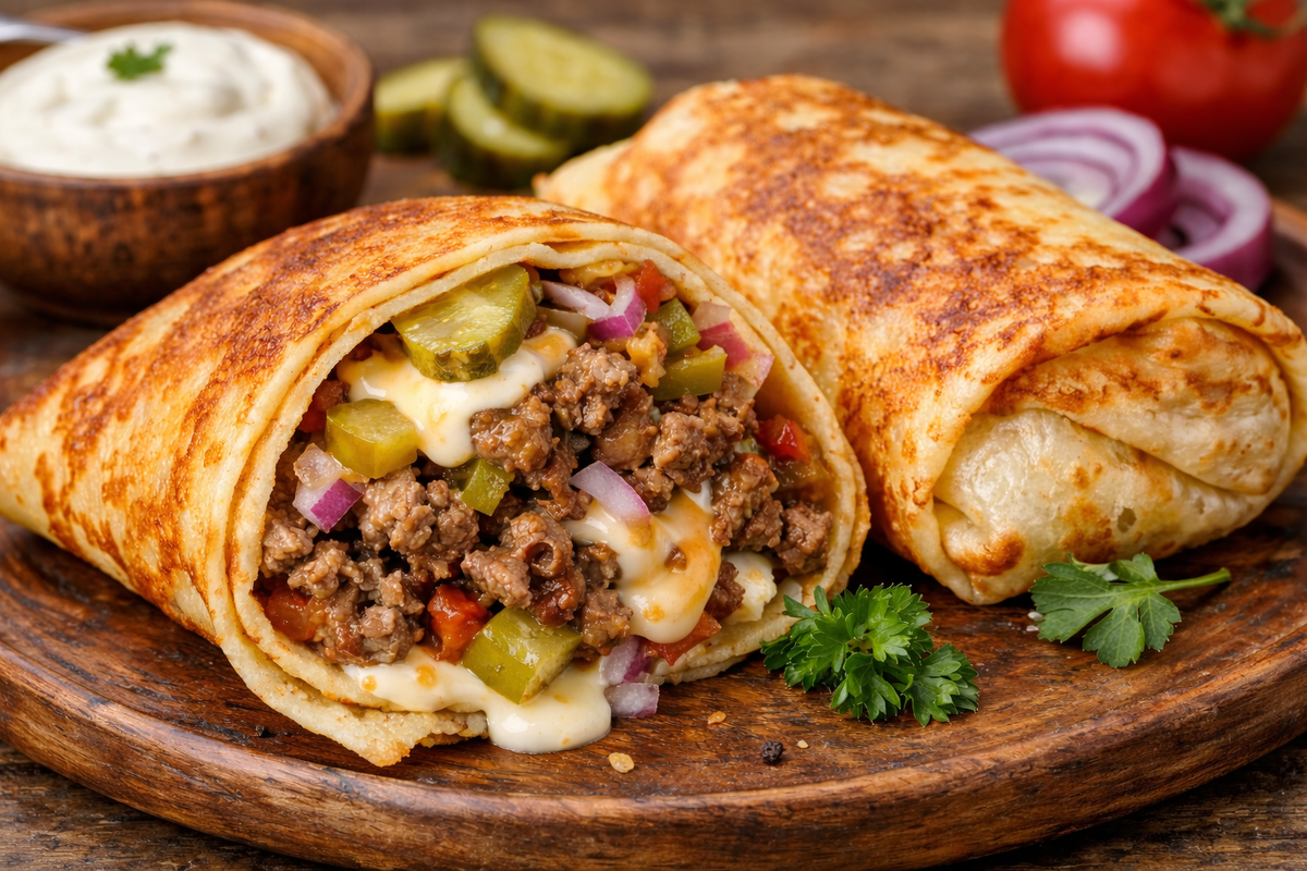 Обжарьте мясо до сочности, добавьте нарезанный огурец и лук. Заполните блин начинкой, добавьте соус и сыр. Этот вариант станет отличной альтернативой бургеру!