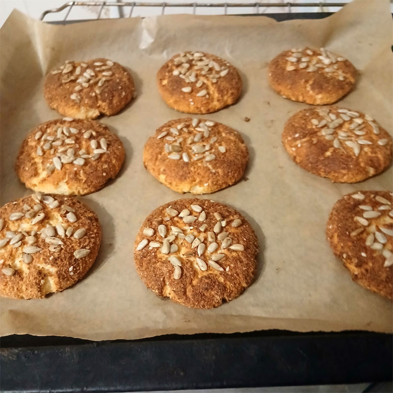 Теперь давайте перейдем к процессу приготовления. Сначала смешайте все перечисленные ингредиенты до получения однородной массы. Далее, скатайте из теста небольшие шарики и выложите их на противень, предварительно застеленный пергаментом. Придайте шарикам плоскую форму и посыпьте сверху семечками.