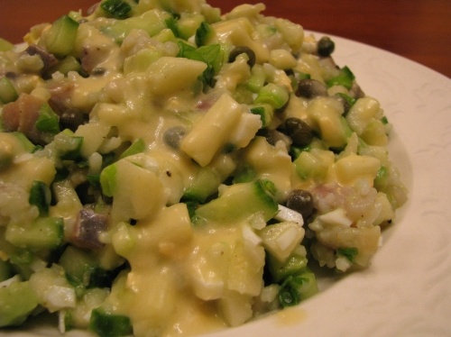 Рекомендуется смешивать ингредиенты непосредственно перед подачей к столу, чтобы сохранить свежесть и яркость вкусов каждого компонента. Для заправки можно использовать майонез или приготовить собственный соус. Для этого разотрите желток с горчицей до однородной массы, без комков – это важно для текстуры соуса. Постепенно добавляйте растительное масло и лимонный сок. Соль и перец добавляйте по вкусу, но будьте осторожны, потому что сельдь и каперсы уже содержат соль.