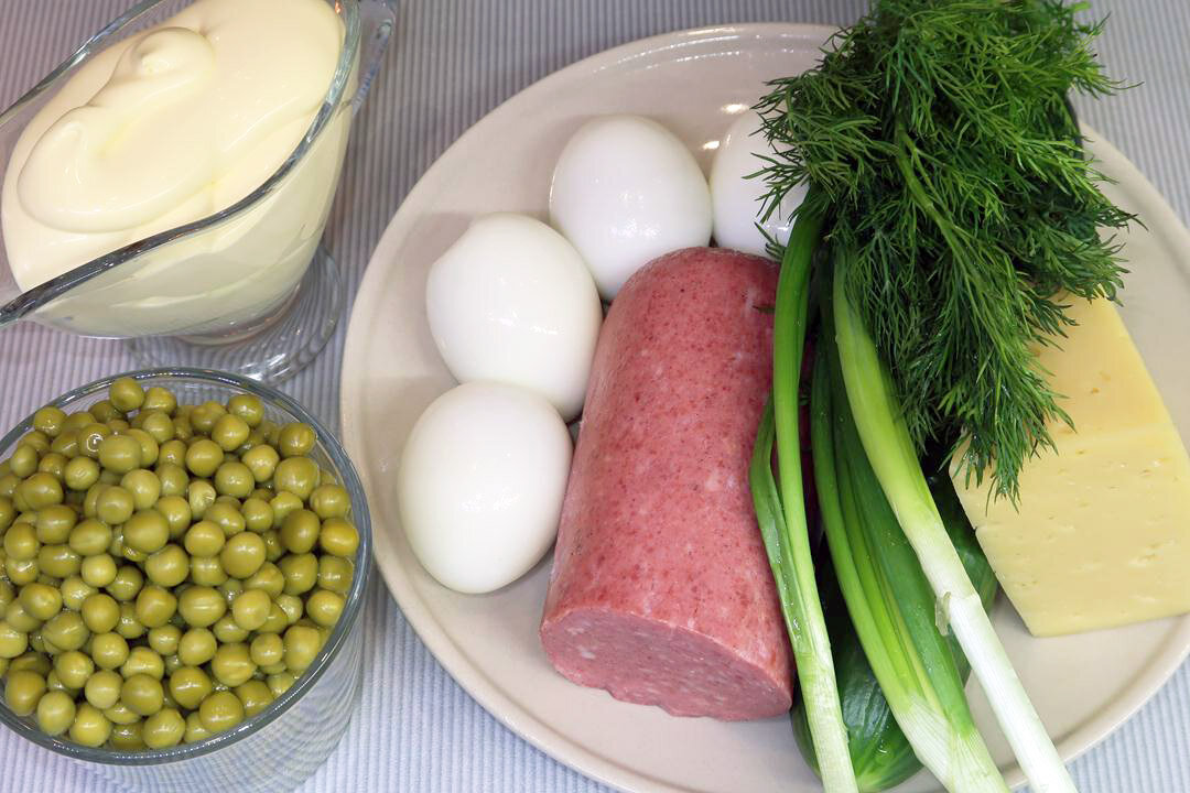 В глубокой миске соединяются все ингредиенты: кусочки колбасы, тертый сыр, огурец, яйца и зеленый горошек (предварительно слить жидкость). Далее добавляется порция майонеза и все хорошо перемешивается.
