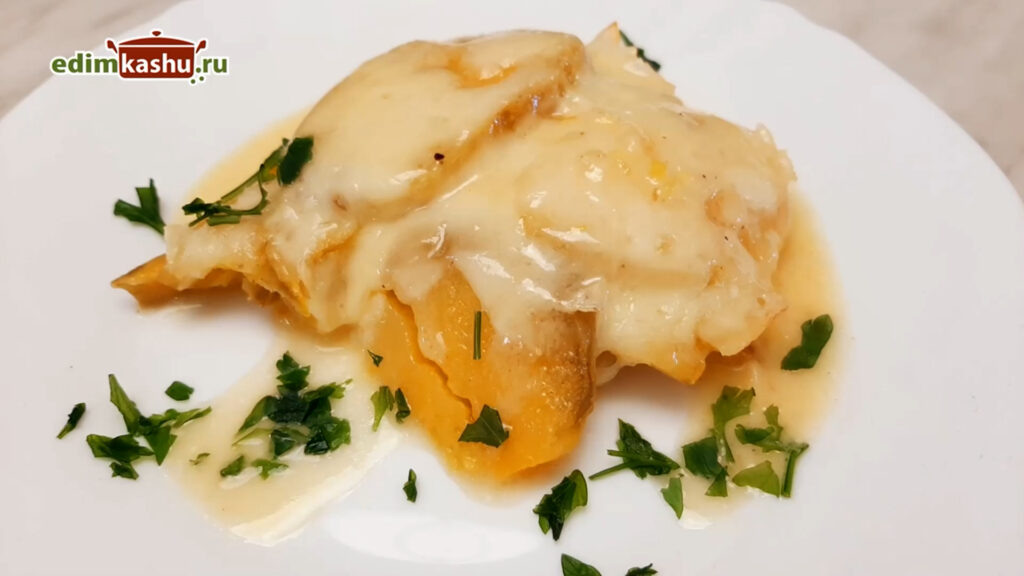 Накрыть форму фольгой и поместить в разогретую до 180 градусов духовку на 20-25 минут. Через 20 минут стоит проверить мягкость батата, проколов его вилкой. Как только он станет мягким, можно покрыть блюдо тертым сыром и вернуть в духовку, но уже без фольги, чтобы сыр расплавился.