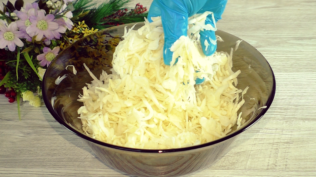 Первый шаг: нашинковать капусту, посолить и тщательно помять, после чего отложить в сторону. Далее в глубокой миске взбить яйца с сахаром; в этом этапе соль не добавляется, так как она уже присутствует в капусте. Для усиления аромата можно внести 0,5 ч. л. прованских трав.