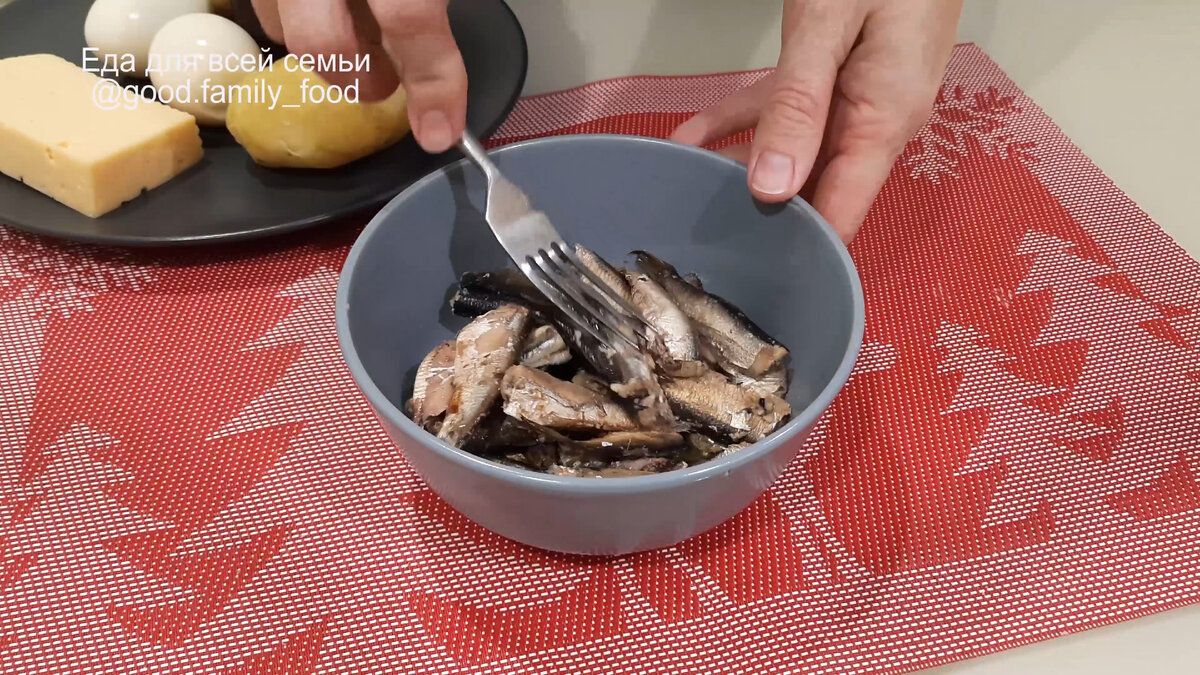 2. Выложите шпроты из банки на тарелку, добавьте масло и разомните их вилкой.