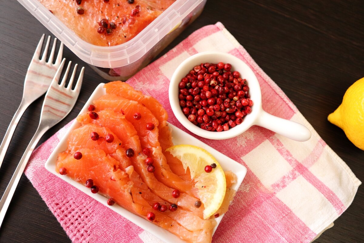 Куски рыбы укладываются кожей наружу. Между ними размещаются несколько тонких колечек лимона. После этого на 1-2 часа рыбку оставляют на кухне, а затем помещают в холодильник на сутки. Не забывайте периодически переворачивать рыбу, чтобы она равномерно просолилась.