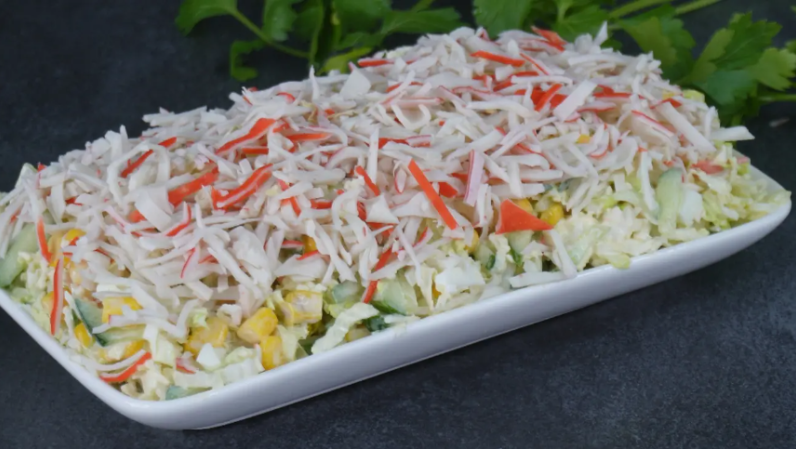 Этот салат стал любимцем зрителей. Его готовят не только на праздники, ведь он не менее популярен, чем традиционное оливье. Структура салата отлично сбалансирована, и он насыщен свежестью и хрустом. Этот салат с крабовыми палочками может уверенно занять место на любом праздничном столе.
