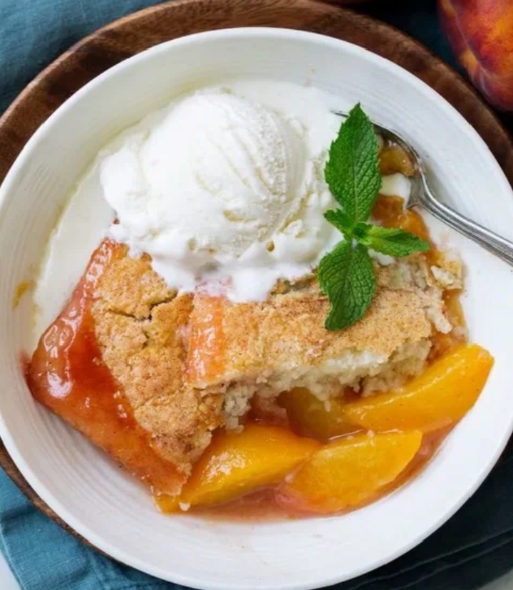 Шаг 3: Сборка и выпекание. Разогреть духовку до 180–190°C. Форму для выпечки смазать маслом. Выложить персики с выделившимся соком и аккуратно положить сверху тесто в виде «островков», оставляя пространство для карамелизации. Выпекать 40–50 минут, пока коблер не подрумянится, а сок не начнет пузыриться.