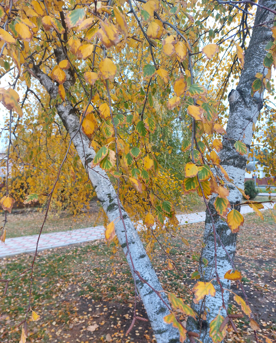 Березы еще радуют глаз желтыми листьями, но многие деревья уже сбросили свой листвяной наряд. Можжевельники, в свою очередь, остались ярким зеленым пятном перед домом с разнообразием оттенков, что добавляет живописности в обстановку.