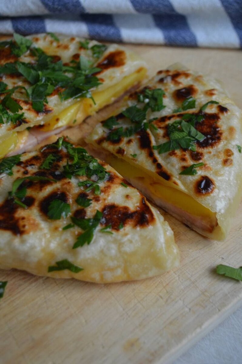 Очистите картошку и нарежьте её кружочками, затем обжарьте до золотистого цвета на 20 граммах сливочного масла. Картошка должна быть почти готова.Раскатайте тесто в круг, ориентируясь на диаметр вашей сковороды.На тесто выложите начинку: нарезанную ветчину, сыр и обжаренную картошку. Сложите края теста к центру.Обжарьте лепешку на сухой сковороде на среднем огне до золотистой корочки с обеих сторон. Переворачивайте её регулярно, чтобы избежать пригорания. Проверьте готовность по бокам теста.Растопите оставшиеся 30 граммов сливочного масла, добавьте дольку чеснока и немного зелени. Смажьте лепешку этой смесью для дополнительного аромата и сочности. Вы можете также просто обмакнуть лепешку в масло и наслаждаться ею в этом виде.Лепешки получаются сытными, хрустящими и ароматными, а начинку можно варьировать по своему вкусу. Не бойтесь экспериментировать!