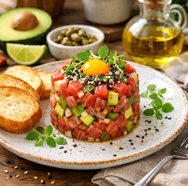 Тартар считается не просто нарезкой рыбы, это целая симфония свежести, текстур и гармоничных вкусов. Основные компоненты — это нежное мясо тунца, бархатистый авокадо и легкая кислинка цитрусовых. К ним прибавляются каперсы, оливковое масло первого отжима и пряные нотки, что создает непревзойденное сочетание. Благодаря этому тартар является символом минимализма и вкусовой чистоты.