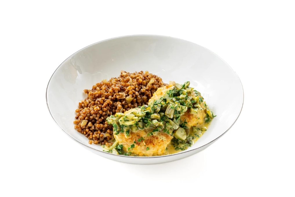 Подготовка: Начать с подготовки всех ингредиентов и разогрева духового шкафа до 180 градусов.Замачивание хлеба: Белый хлеб следует залить минеральной водой и оставить на некоторое время, чтобы он размягчился.Приготовление фарша: Морковь натереть на мелкой терке, соединить с куриным фаршем, отжатым хлебом и солью. Хорошо перемешать до однородной массы.Приготовление лука: Лук нарезать мелкими кубиками. В сковороде разогреть сливочное и растительное масло, обжарить лук до золотистого цвета.Формирование котлет: Готовый фарш разделить на небольшие порции, обвалять в муке и сформировать котлеты.Гречка: Добавить к луку гречневую крупу и обжарить в течение минуты, затем залить бульоном, довести до кипения и убрать в духовой шкаф на 10 минут.Обжаривание котлет: На разогретую сковороду выложить котлеты и обжарить до румяной корочки с обеих сторон.Финальный аккорд: Выложить котлеты в сотейник к гречке и вернуть в духовку на еще 10 минут для пропаривания.Приготовление соуса: Мелко нарезать петрушку и маринованные огурцы, соединить с горчицей и рассолом.Подача: На тарелку выложить котлеты, гречку и полить соусом из огурцов перед подачей на стол.Такое блюдо не только сытное, но и очень вкусное, оно украсит любой стол, благодаря своей гармонии вкус и оригинальности.