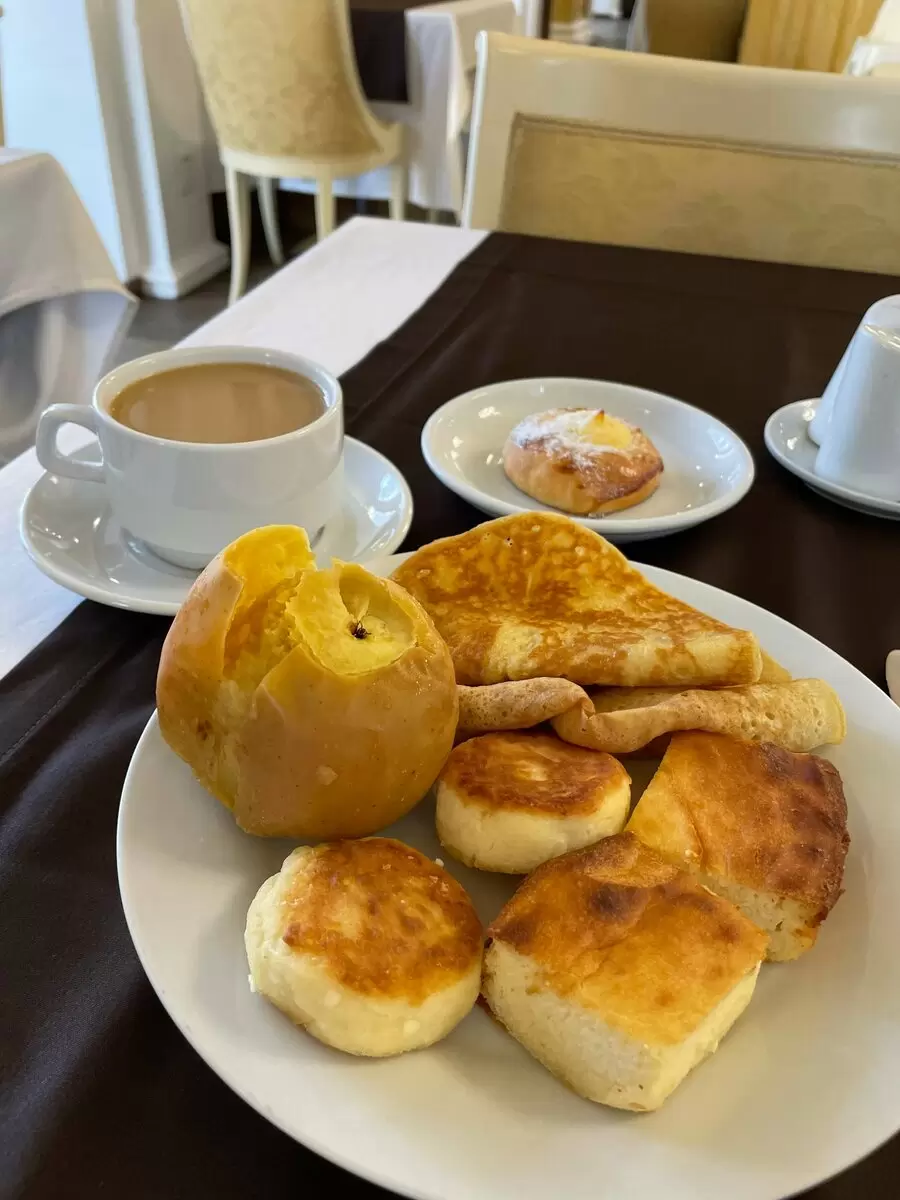 Сегодня на завтрак предлагались аппетитные сырники и творожные запеканки — по две штуки на порцию, а также печенье с яблоком, блин и ватрушка с чашкой кофе. В качестве перекуса был выбран ароматный сулугуни.