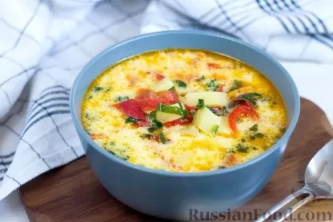 - Сырный суп: Нежный и бархатистый, с зеленым горошком и яичной лапшой. Чуть усилий — и на вашем столе появляется легкое и вкусное блюдо.