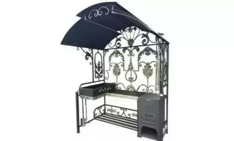 Яркое оформление, выполненное в дворцовом стиле с позолоченной патиной, станет украшением любого праздника. Ажурная ковка ручной работы подчеркивает оригинальность конструкции. Съёмная жаровня с ребрами жесткости удерживает форму и позволяет удобно установить до 10 шампуров. Кроме того, скатная крыша с вентиляционными отверстиями дает возможность готовить в любую погоду.