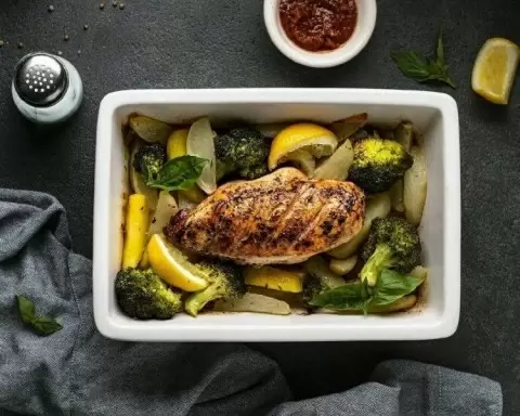 Выложить картофель в форму для запекания, сверху разместить курицу и брокколи. На курицу положить небольшие кусочки сливочного масла, а в форму добавить 2–3 столовые ложки воды. Накрыть фольгой и ставить в предварительно разогретую духовку на 170-180°C на 35–40 минут. За 10 минут до готовности снять фольгу, чтобы курица и картофель подрумянились.