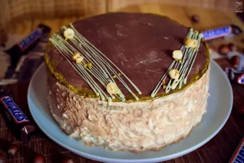 Торт Сникерс потрясающе напоминает знаменитый батончик, поэтому будет идеальным угощением для всех сладкоежек. С шоколадным бисквитом, творожным кремом, насыщенной карамелью и орехами этот десерт готов поразить ваш вкус. В качестве орехов можно использовать как фундук, так и арахис — выбор зависит от предпочтений. Однако многие подтверждают, что с фундуком торт получается вкуснее!