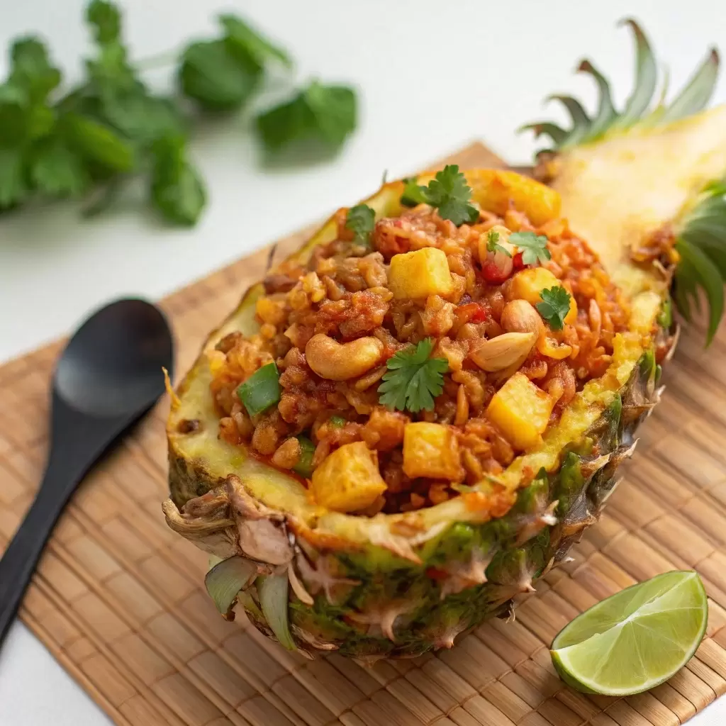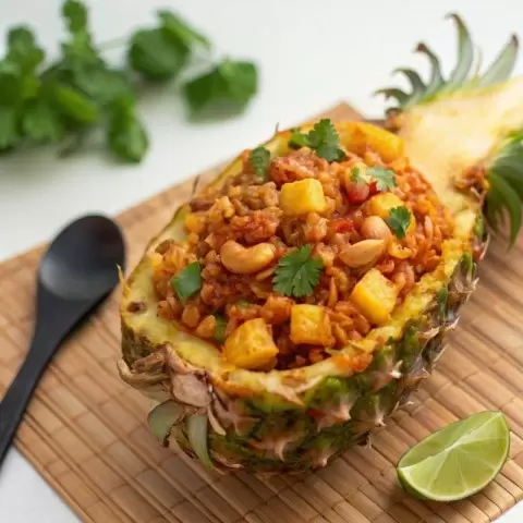 - Жареный рис с ананасом и кешью: необычное сочетание сладкого ананаса и хрустящего кешью добавляет в это блюдо экзотичности. Просто обжарьте рис с чесноком, куркумой и добавьте ананас и кешью.