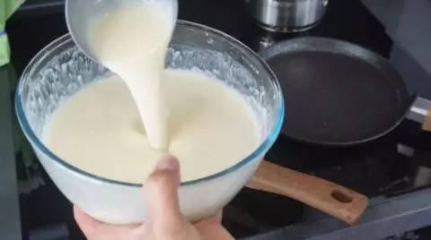 Начать следует с разбивания яиц в глубокой миске. Добавив соль и сахар, тщательно перемешать, затем влить молоко и вновь перемешать. Кипятить 230 мл воды — это важный момент. Кипящая вода не должна влиять на тесто, зато помогает создать нужную текстуру. Это позволит избежать комочков и придаст блинам идеальную эластичность.