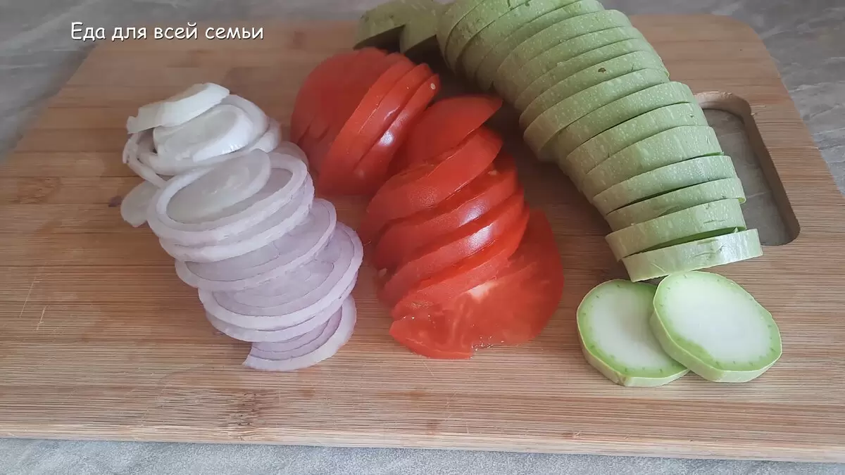 Для начала нужно нарезать кабачок, помидор и лук кольцами. Если под рукой есть свежая зелень, такая как укроп, кинза или зеленый лук, это придаст блюду невероятный аромат. Однако это не критично, если зелени нет.