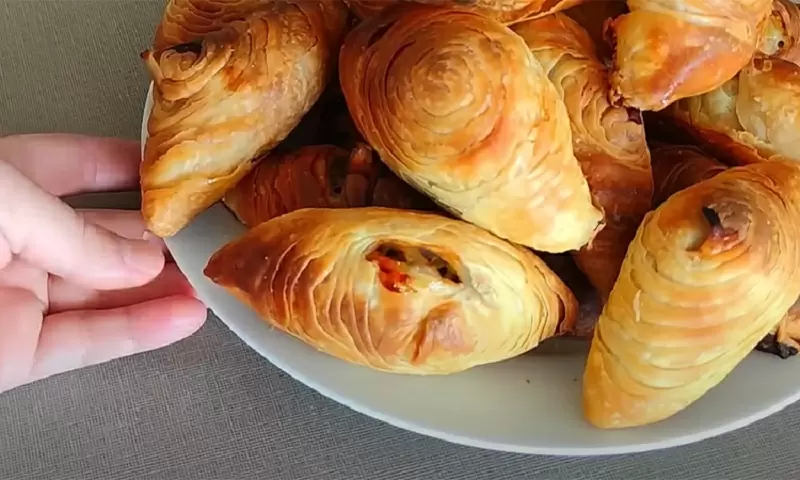Секрет слоистости заключается в раскатывании теста с последующим соединением слоев смазанного маслом. Заготовки нарезаются кругами, после чего их нужно наполнить мясной смесью и формировать классические треугольники. Это уже приведёт к неповторимому результату.