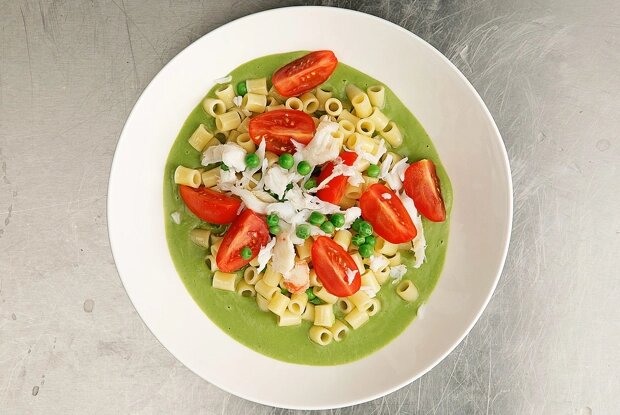 В сковороде разогреть 20 грамм оливкового масла и обжарить лук с панчеттой до румяности. Добавить 200 грамм горошка, и как только он начнет уменьшаться в размере, снять с огня. Затем переложить эту массу в блендер, пробить и процедить через мелкое сито для достижения однородной консистенции.Отварить пасту до состояния аль денте, чтобы она осталась слегка упругой при укусе.В другой сковороде разогреть оставшиеся 20 грамм оливкового масла, быстро прогреть оставшийся горошек в течение одной минуты, затем добавить готовую пасту и тщательно перемешать. На глубокую тарелку влить приготовленный соус из горошка, выложить на него пасту, украсить кусочками крабового мяса, половинками помидоров черри и щедрой порцией тертого пармезана. Для завершающего акцента сбрызнуть оставшимся оливковым маслом и при желании добавить нарезанный перец чили.Такое блюдо непременно удивит ваших гостей и станет яркой изюминкой любого стола. Не упустите возможность порадовать себя и своих близких этой изысканной пастой!