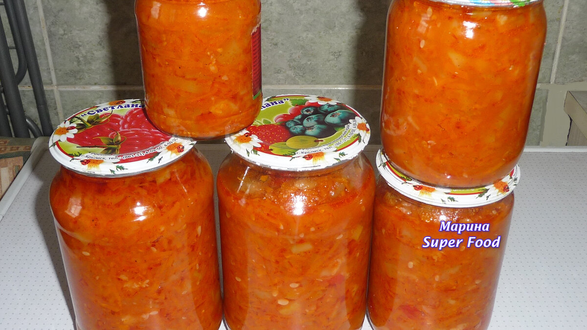 За 10 минут до завершения готовки в салат добавляют уксус и тщательно перемешивают. Остуженные банки наполняются горячим салатом, закатываются и переворачиваются, чтобы обеспечить герметичность. После этого они оставляются при комнатной температуре до полного остывания.