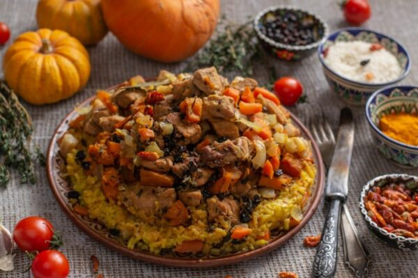 В процессе готовки замочите рис, промойте его и добавьте в кипящий зирвак. Уровень воды можно подкорректировать, если потребуется. После закипания уменьшите огонь и следите, чтобы рис впитал всю жидкость. Затем в середину закладите тыкву и курагу, укройте рисом и готовьте еще 20 минут. Перед подачей проверьте на соль и перемешайте. Дайте настояться немного перед подачей на стол, и наслаждайтесь!