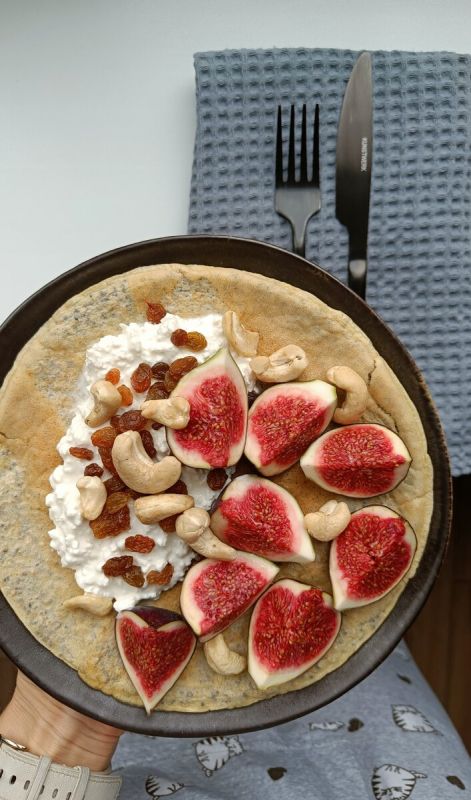 Выпекайте массу на сковороде с небольшим количеством растопленного масла до образования золотистой корочки с обеих сторон. Подавайте блин с ягодами, фруктами и орехами. Приятного аппетита!