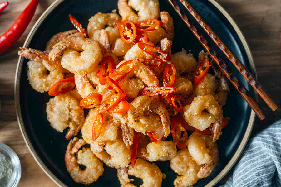 Просушите креветки с помощью бумажного полотенца.В отдельной миске соедините кукурузный крахмал с солью. Поместите туда креветки и тщательно перемешайте, чтобы они покрылись тонким слоем крахмала.Подготовьте смесь из соли и молотого черного перца в небольшой тарелке.Измельчите чили перец и чеснок, чтобы раскрыть их ароматы.В глубокой сковороде разогрейте растительное масло до температуры около 180°C. Для проверки опустите в масло бамбуковую палочку — если вокруг нее появится много пузырьков, можно начинать жарку.Аккуратно выкладывайте креветки в сковороду в один слой, предварительно стряхнув лишний крахмал. Обжаривайте их в несколько этапов до золотистого цвета. Готовые креветки переложите на бумажные полотенца или решетку, чтобы избавиться от лишнего масла.Слейте излишки масла, оставив немного для последующей жарки. Добавьте в сковороду чили и чеснок, обжаривайте до появления яркого аромата.Верните креветки в сковороду, посыпьте смесью соли и перца, тщательно перемешайте, чтобы они равномерно покрылись специями. Снимите с огня.Чтобы добавить изюминку, замените молотый черный перец на сычуаньский, и ваше блюдо приобретет уникальный вкус и легкое покалывание, пишет канал.