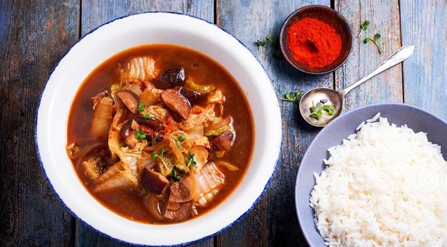 Рекомендуется попробовать новую интерпретацию традиционного блюда — щи, которые вместо белокочанной капусты включают в себя пикантное кимчи, а шиитаке заменяют обычные лесные грибы или шампиньоны. К этому восхитительному блюду отлично подойдет отварной рис, который добавит не только текстуры, но и насыщенности.