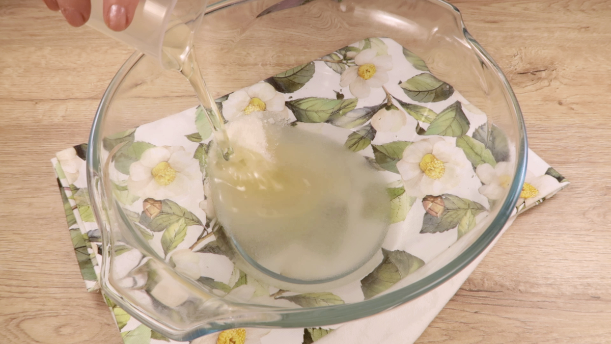 1. В глубокой посуде смешать сахар, соль, ванильный сахар, воду и растительное масло. Взбить венчиком до полного растворения сахара.