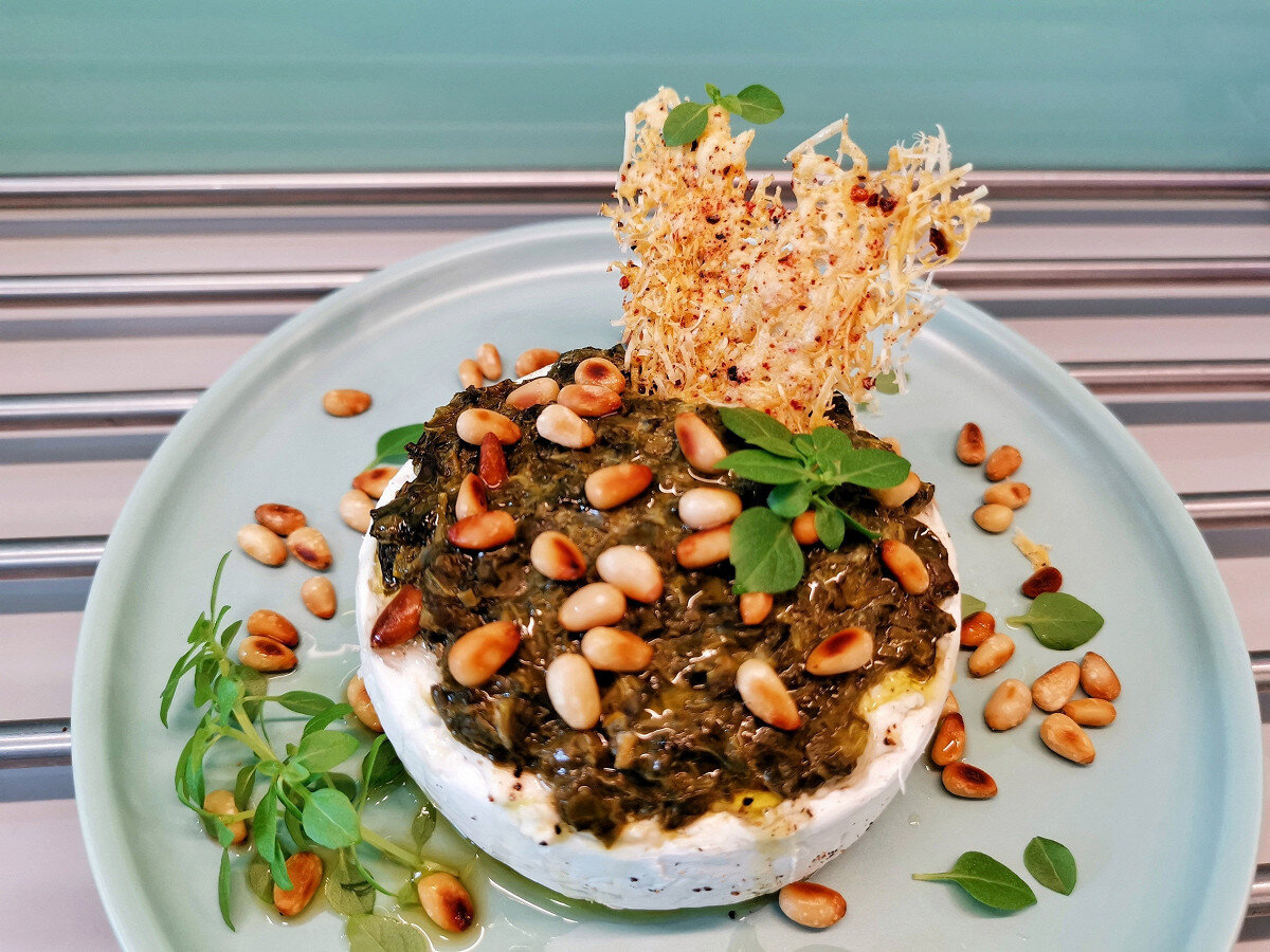 Поджарьте кедровые орехи на сухой сковороде, следя за их золотистым цветом. Готовый камамбер аккуратно переложите на сервировочное блюдо и добавьте слегка остывшие сырные «крекеры». Доливайте оливковое масло, придавая блюду дополнительную сочность. Завершите оформление, посыпав все ингредиенты обжаренными орехами и свежим базиликом.