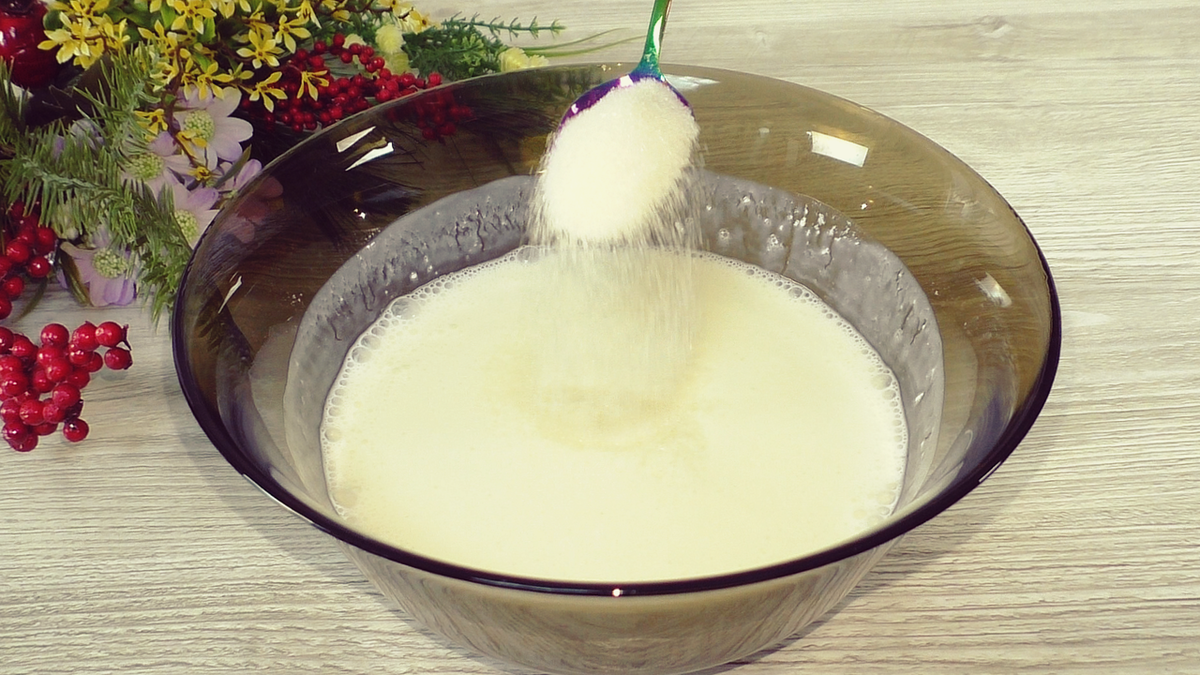 Для начала кефир нужно немного подогреть до теплого состояния, чтобы он был комфортным для замешивания. Это можно сделать в микроволновке или поставив емкость с кефиром в горячую воду. В теплый кефир добавляется соль и сахар — последний даже в случае соленой начинки сыграет свою роль.