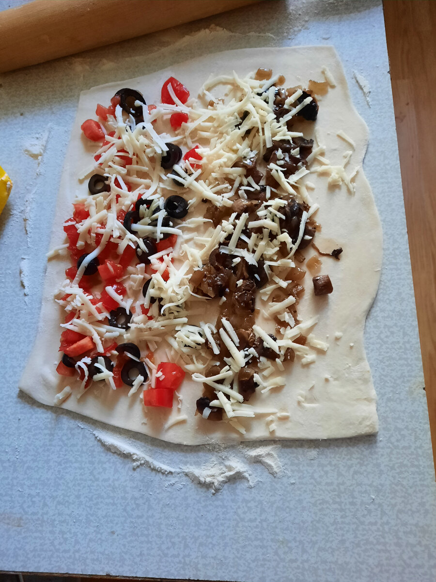 Раскатайте тесто на присыпанной мукой поверхности. Равномерно распределите начинку, оставив немного места от одного края. Сверху посыпьте тертым сыром.