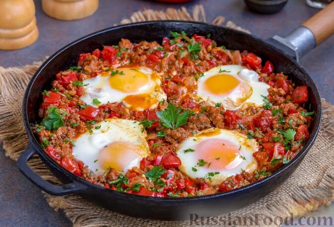 Не забудьте попробовать шакшуку с говяжьим фаршем, которая послужит отличным вариантом для завтрака или сытного перекуса. Сочетание яиц, помидоров и сладкого перца делает это блюдо поистине аппетитным.