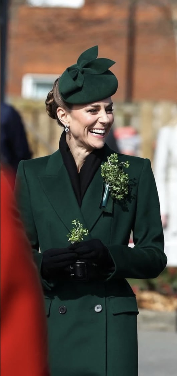 Как и положено, принцесса Уэльская, Кэтрин, отметила день святого Патрика по всем правилам: на грудь она приколола букетик живой зелени и с гордостью вышла на встречу с ирландскими гвардейцами. Её наряд стал настоящим предметом обсуждения в социальных сетях и новостных порталах.