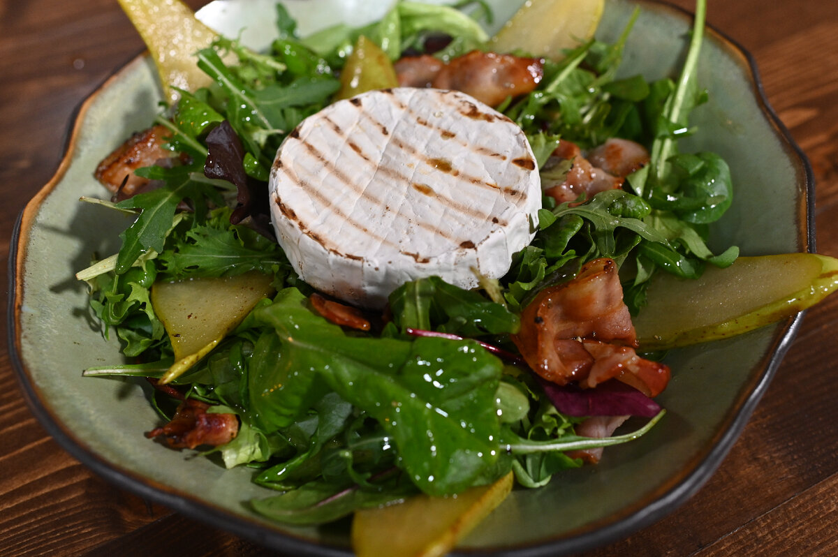 Шеф-повар Григорий Мосин из популярной программы «Сытная кухня» представляет удивительный салат, который точно станет украшением любого стола. Это яркое блюдо гармонично сочетает в себе сладость груши, пикантность бекона и нежный сыр бри, что делает его настоящим гастрономическим произведением искусства.