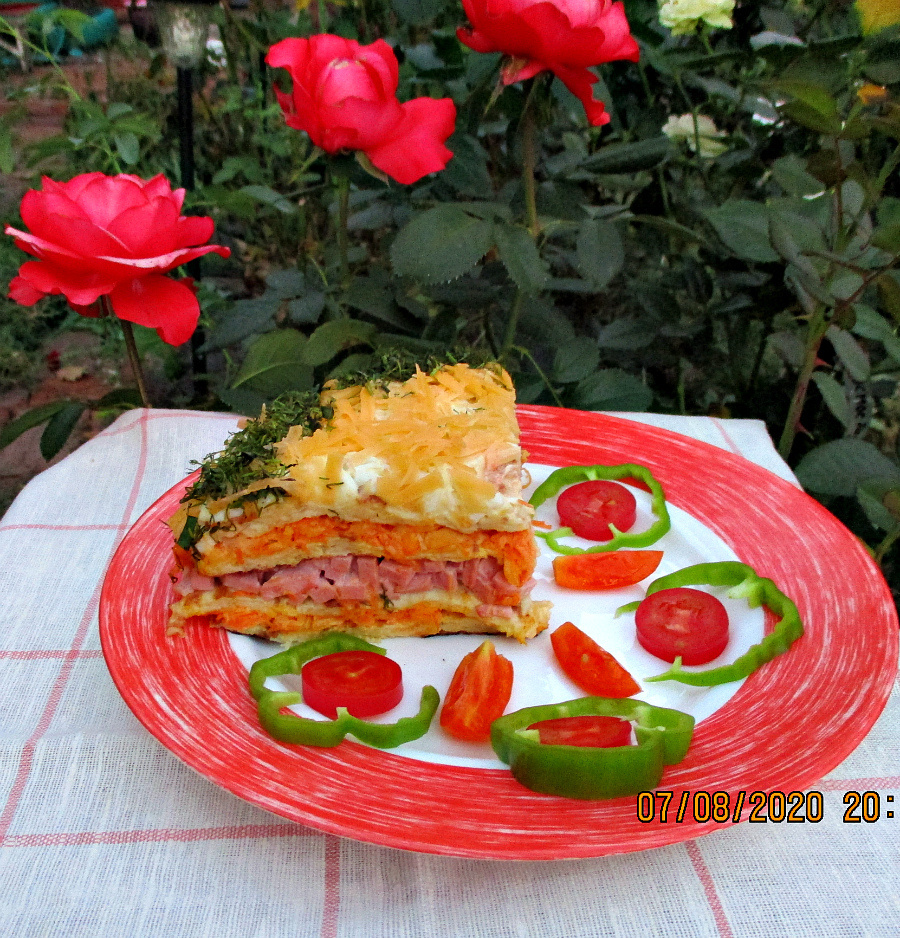 Когда блины остынут, приступайте к сборке торта. Удобнее всего использовать разъемную форму, но можно обойтись и блюдом. Положите первый блин, затем треть начинки с морковью и сыром. Повторите процесс для следующих слоев, чередуя начинки, укладывая по блинчику и завершая тертым сыром и зеленью.