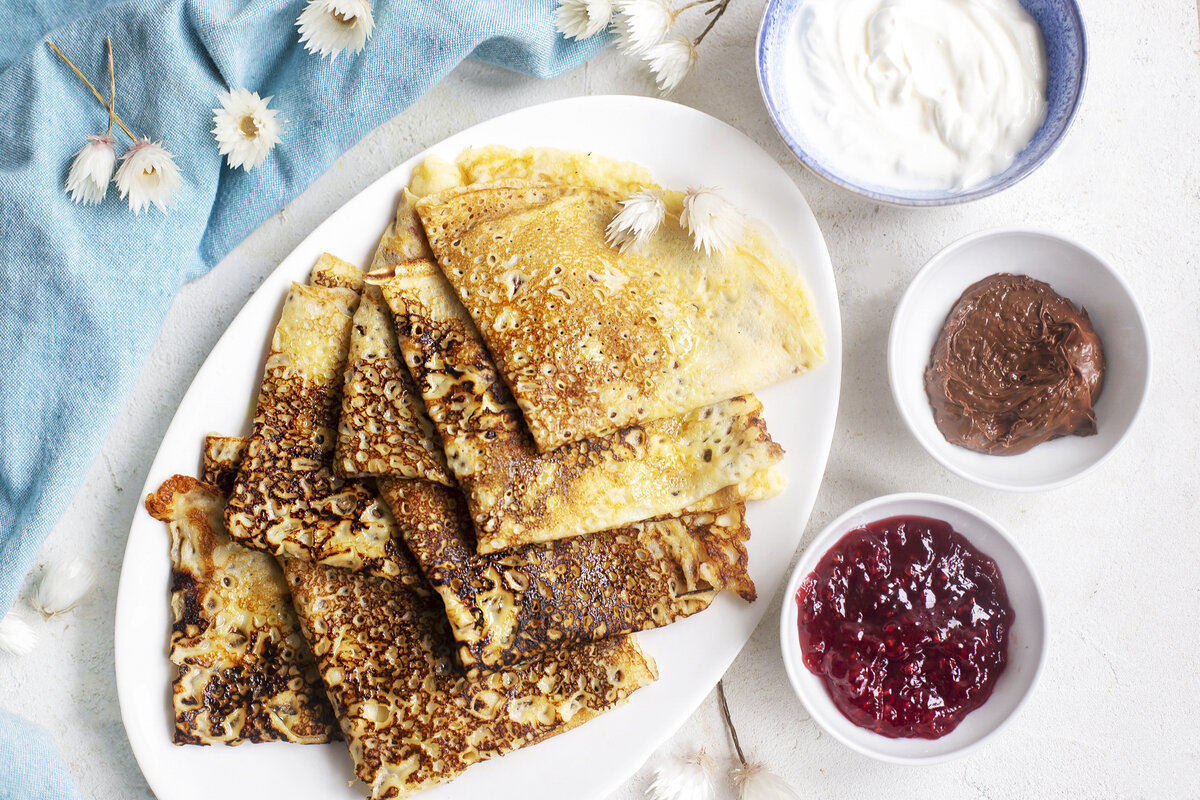 Для подачи подготовьте несколько мисок с вареньем, сметаной и шоколадной пастой. Выложите блины на тарелку и подавайте к столу.