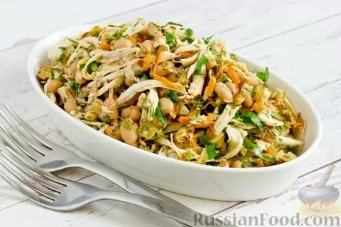 Классический салат, где отварное куриное мясо встречается с хрустящей белокачанной капустой, сыром фетой и твёрдым сыром. Это сочетание обладает многогранным вкусом благодаря свежим яичным белкам, а добавление майонеза делает его особенно нежным. Этот салат станет настоящей находкой для любителей мясных блюд.