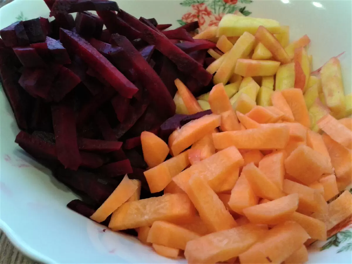 Свеклу и морковь лучше нарезать, а не тереть. Лук и болгарский перец также тщательно измельчаются, брокколи стоит разморозить и разделить на мелкие кусочки.