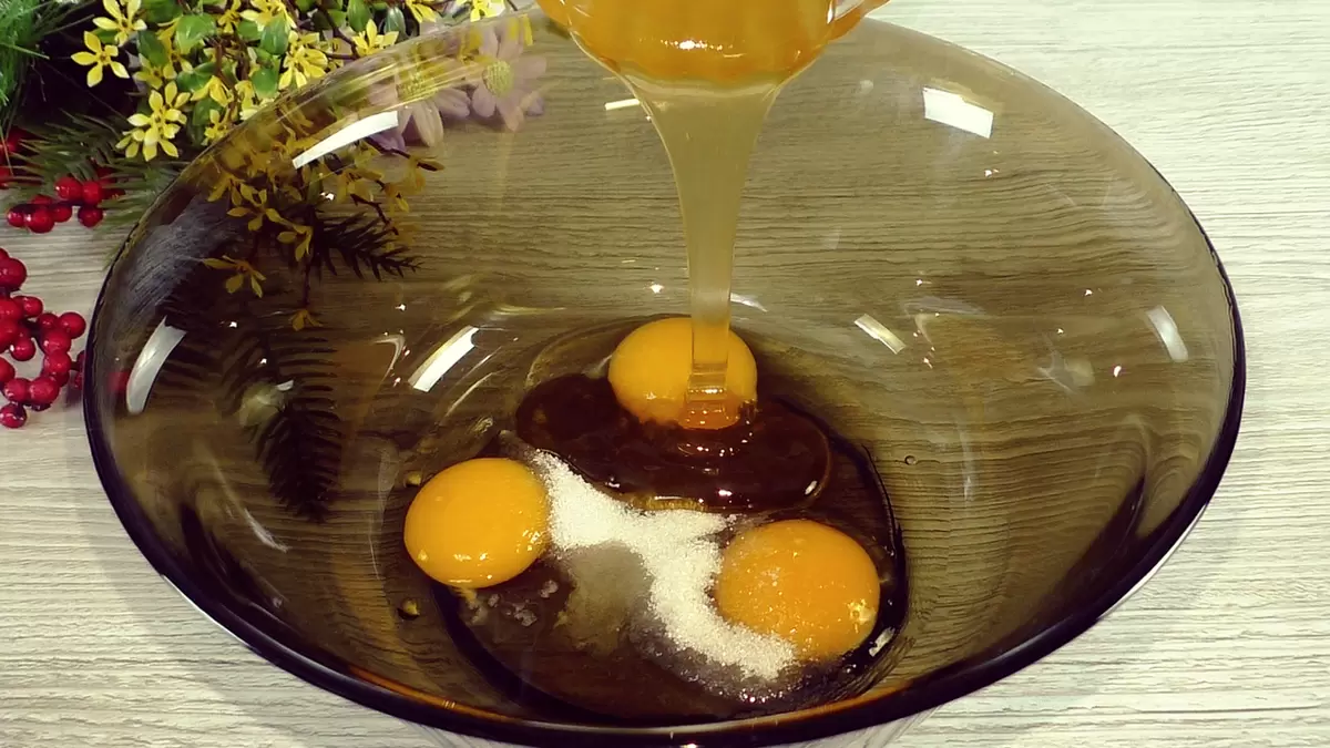 Перейдем к процессу приготовления: в удобной миске тщательно смешивают яйца с солью и сахаром. Далее добавляют мед, который нужно предварительно подогреть до жидкой консистенции — это можно сделать на водяной бане или в микроволновке, используя короткие импульсы.