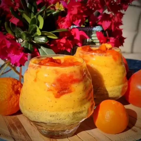 3. Для второго слоя в блендер отправляются оставшаяся тыква, банан и мандарины, которые также следует взбить до однородной консистенции. Получившуюся массу выливаем в бокалы и равномерно распределяем.