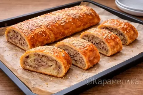 Сначала вынимают слоёное тесто из холодильника и оставляют его при комнатной температуре до полного размораживания. Так оно станет мягким и податливым.Пока тесто размораживается, подготавливают начинку. Лук очищают и мелко нарезают, чтобы он лучше растворился в фарше и добавил сочности.На сковороде разогревают растительное масло, добавляют лук и обжаривают до золотистого цвета примерно 4–5 минут.К обжаренному луку добавляют фарш, предварительно приправив его солью и перцем. Для улучшения текстуры можно добавить немного творога, он сделает начинку рассыпчатой.Фарш с луком продолжают жарить ещё 8–10 минут, разбивая lumps. Начинка должна быть сочной и рассыпчатой.Когда фарш готов, его снимают с огня и оставляют остывать.Рабочую поверхность посыпают мукой, раскатывают тесто в прямоугольник размером 31 на 27 см.На тесто равномерно выкладывают остывшую начинку, оставляя по 2 см от краёв.Скатывают тесто в рулет, плотно защипывая края.Перемещают рулет на противень, застеленный пергаментом, швом вниз, и смазывают взбитым желтком. По желанию можно посыпать кунжутом.Выпекают в разогретой до 180 градусов духовке в течение 40–45 минут. Если поверхность начнёт подгорать, её можно прикрыть пергаментом.Достав рулет из духовки, дают ему немного остыть, чтобы кусочки получились аккуратными и вкусными. Этот рулет одинаково хорош как горячим, так и холодным, идеально подходит для перекуса или в качестве дополнения к горячим блюдам.