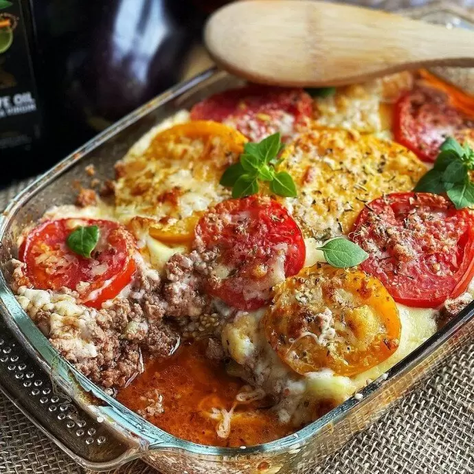 5. В огнеупорную форму выкладывайте компоненты: первым слоем баклажаны, затем фарш, промежуточный соус бешамель. Через слой положите снова баклажаны, фарш, бешамель, сверху натертую моцареллу и кольца помидоров. Не забудьте немного посолить и добавить итальянские травы. В завершение присыпьте пармезаном. Обратите внимание: указанные пропорции предназначены для небольшой формы и двух слоев запеканки.
