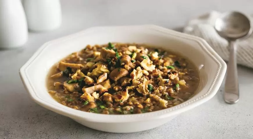 Суп с гречкой и грибами воплощает в себе идеальную гармонию классических ингредиентов. Результат получается не только восхитительным, но и удивительно простым в приготовлении. В качестве изюминки в этот суп добавляются грецкие орехи, обогащающие вкус и придающие интересную текстуру. А причудливый аромат, который заполняет кухню, происходит от присутствия сушёных белых грибов, без которых просто не обойтись!