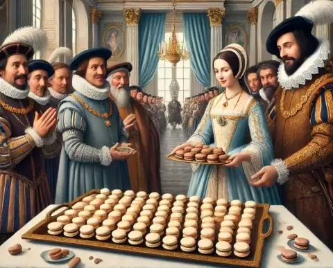 В XVI веке макароны добрались до Франции благодаря Екатерине Медичи. Они быстро завоевали популярность в королевских дворах. Легенда гласит, что казалось бы простое лакомство стало популярным благодаря любви Марии Антуанетты к сладостям. Впрочем, того вида макаронов, который знают сегодня, еще не существовало. Это были простые миндальные печенья, которые не имели тех ярких цветовых вариаций и вкусовых начинок, характерных для современных десертов.