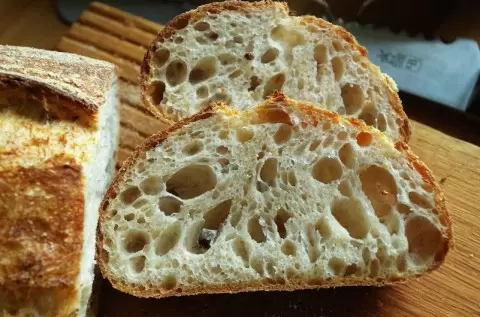Готовый хлеб лучше нарезать после полного остывания. Он прекрасно подходит со сливочным маслом, вареньем или в качестве гарнира к супам и для бутербродов.