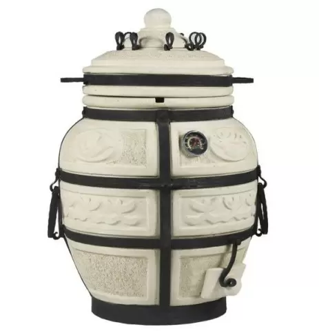 Корпус тандыра выполнен из огнеупорной шамотной глины белого цвета и украшен оригинальным орнаментом. Для дополнительной прочности используются металлические полосы с уникальным дизайном. В комплект входят все необходимые принадлежности для начала работы: кочерга, совок и колосник. Также предусмотрен удобный чехол для хранения, защищающий от пыли и влаги.